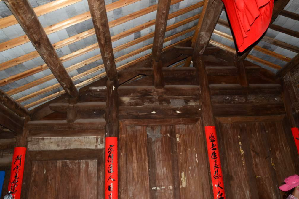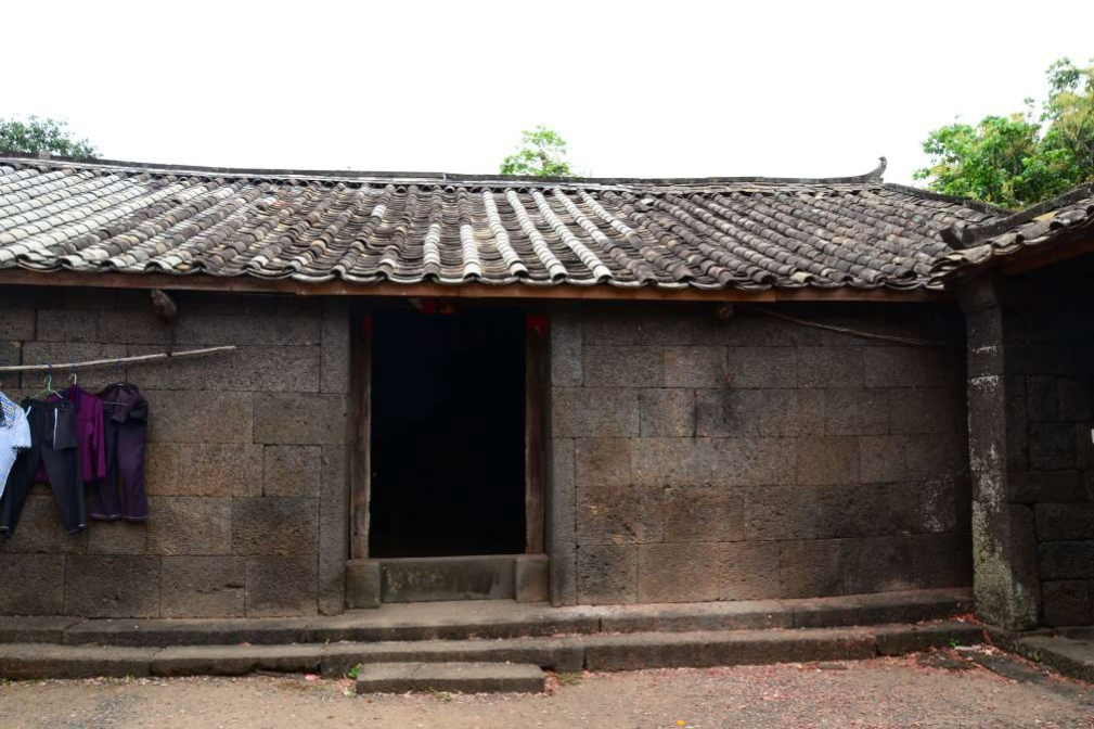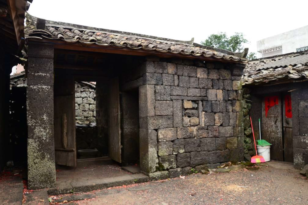 该院落格局保存较好,由两院两进屋及一女儿房(门房)一杂屋组成,建筑质量基本完 好,整体风貌较好,具有典型的琼北羊山地区传统民居特点,始建于晚清;其中,院门东北 侧为该院落的正屋,以客厅和卧室等功能为主,西南侧为次屋,现状以厨房和杂物房功能为 主。 正屋建筑为三开间的平面布局,建筑主要朝向为东北—西南向,与琼北地区主导风向基 本一致;屋顶为硬山灰瓦坡屋顶;外墙采用干砌工艺由火山石砌筑而成;正门均为双扇对开 板门,未开设窗户;建筑内部梁架结构为穿斗式,梁头雕刻有火山图腾样式的雕花,木架均 为晚清留存至今,无漆;室内隔断均为木质隔断;太师壁上方为神龛,雕刻有喻意“四季平 安”、“花开富贵”的精致镂空雕花;室内地面铺装原为夯土,现已被水泥地面取代。 女儿房是一间约 12 平方米、位于院门旁的小房屋,平时一般作为臵物间,但当户主女儿 出嫁前夕,该房屋即为女儿休息及婚嫁当日的出阁之所。