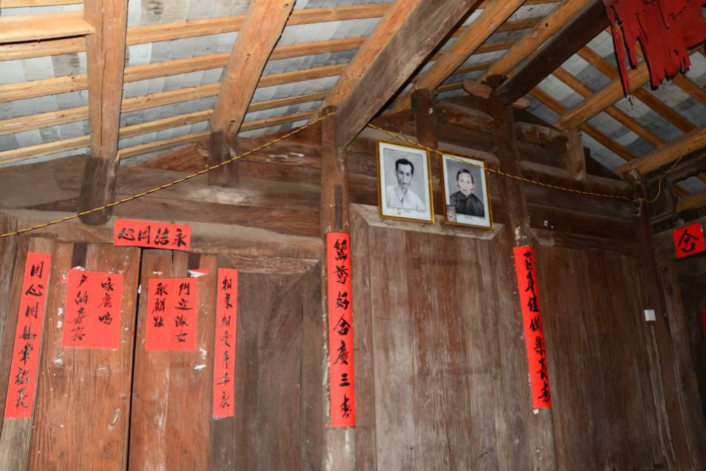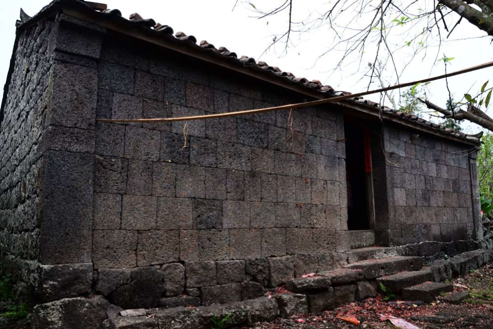 该院落由一进正屋及多间杂屋组成,正屋建筑质量基本完好,整体风貌较好,具有典型 的琼北羊山地区传统民居特点,始建于清代;杂屋部分已倒塌;现状该院落仍为居住功能。 正屋建筑为三开间的平面布局,建筑主要朝向为东北—西南向,与琼北地区主导风向基 本一致;屋顶为硬山灰瓦坡屋顶,近年已重修;外墙采用干砌工艺由火山石砌筑而成;正门 均为双扇对开板门,黑铁铸造的门当样式古朴,自清代留存至今;正屋未开设窗户;建筑内 部梁架结构为穿斗式,木架均为清代留存至今,无漆;室内隔断均为木质隔断;太师壁上方 为神龛,雕刻有火山图腾样式和喻意“平安如意”的简易雕花,前方摆设供奉桌;室内地面 铺装原为夯土,现已被水泥地面取代。