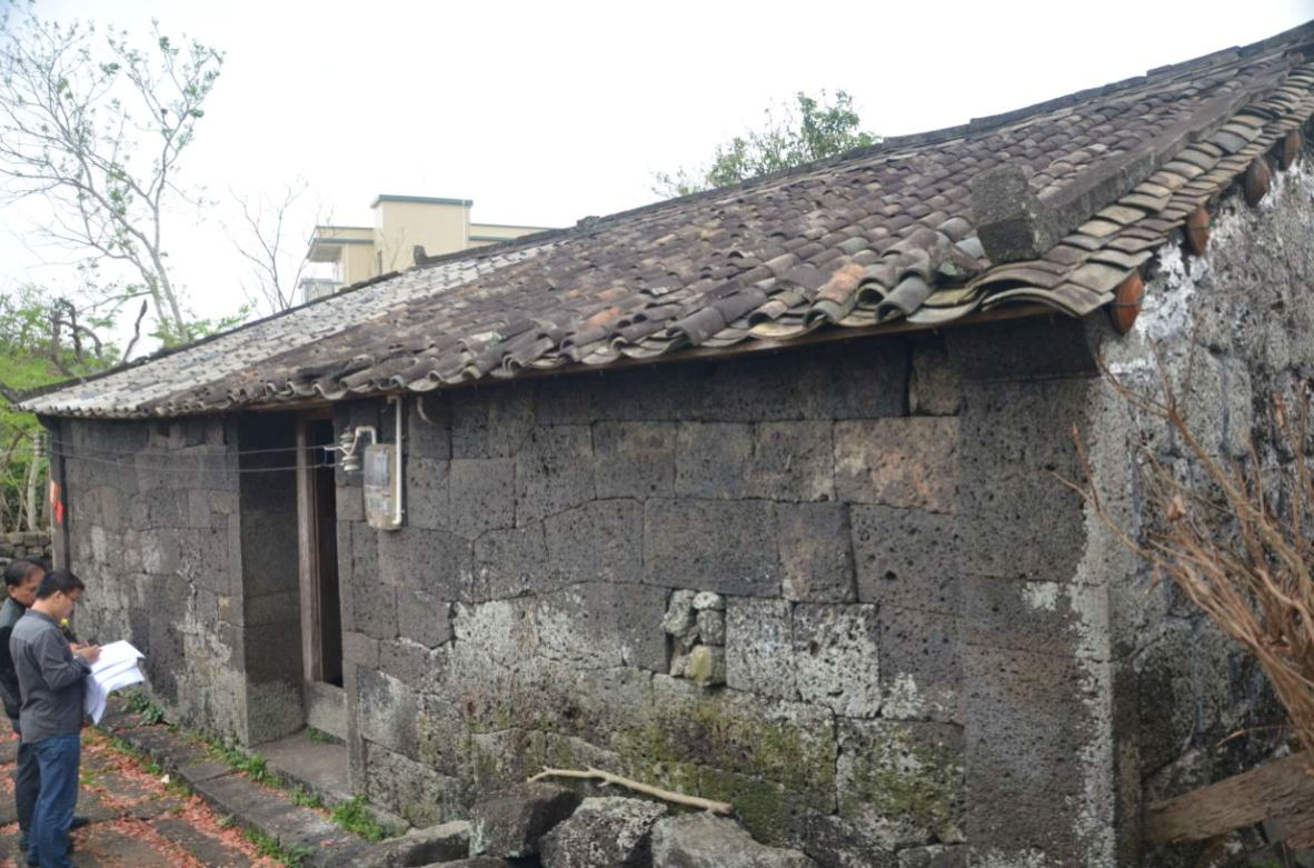 该院落整体格局及和风貌保存较好,由两进正屋和四间横屋组成。正屋建筑为琼北羊山 地区传统民居样式,始建于民国,近年部分房屋的屋顶和窗户已经翻新,但建筑墙体和内部 结构等仍基本留存原貌,建筑质量均一般;现状该院落仍以居住功能为主。 两进正屋均为三开间的平面布局,屋顶为硬山灰瓦坡屋顶,近年已重修;外墙采用干砌 工艺由火山石砌筑而成;正门均为双扇对开板门,未开设窗户;建筑内部梁架结构为穿斗式, 采用铆榫工艺搭建,无漆,内隔断均为木质隔断,太师壁上方为神龛,前方摆设供奉桌;房 屋主体结构均为民国留存至今,其中北侧的正屋梁架结构保存较好,而南面的正屋因久未居 住而年久失修,梁架结构损坏较严重;房屋室内地面铺装原为夯土,现已被水泥地面取代。 四间横屋也均为火山石砌筑的硬山坡屋顶建筑,大多为一层建筑。其中有一间为二层建 筑,内部采用竖爬梯上下楼,二层楼板为木质楼板,内墙体抹灰装饰。