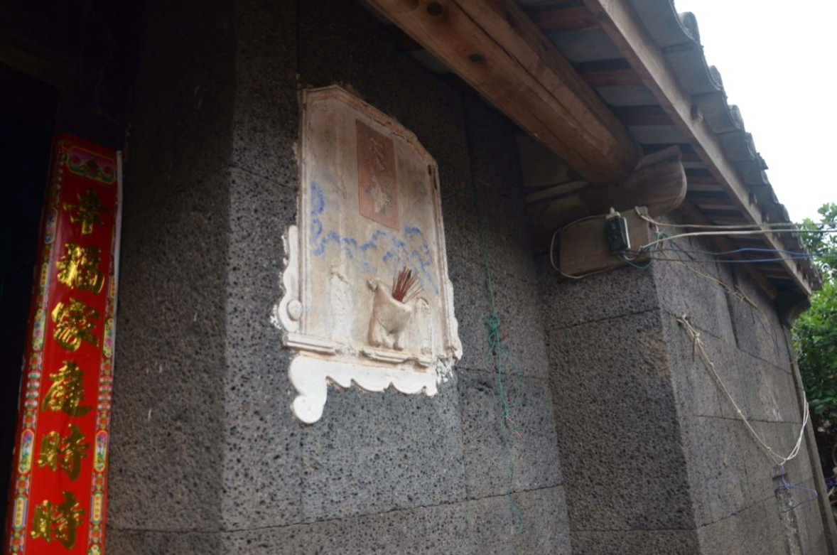 该院落整体格局和风貌保存较好,由一正屋一女儿房(门房)和多间横屋组成,建筑质 量较好,具有较典型的琼北羊山地区传统民居风格特色,始建于清代,现状仍为居住功能。 该院落内的建筑外墙均采用干砌工艺由火山石砌筑而成,墙体未填缝;正屋大门为双扇 对开板门,门旁墙面设有香炉,并配彩画;大门两侧开设的窗户尺寸较小,仅约 300mm× 300mm;正屋内部梁架结构为穿斗式,采用铆榫工艺搭建;室内隔断均为木质隔断,太师 壁上方为供奉台,雕刻有喻意“四季平安“、”花开富贵“、”福寿“、”万寿“等精致雕 花,前方摆设供奉桌;该建筑内重要的梁架结构和隔断均为清代留存至今;室内地面铺装原 为夯土,现已被水泥地面取代;屋顶形式为硬山灰瓦坡屋顶,近年曾重修。