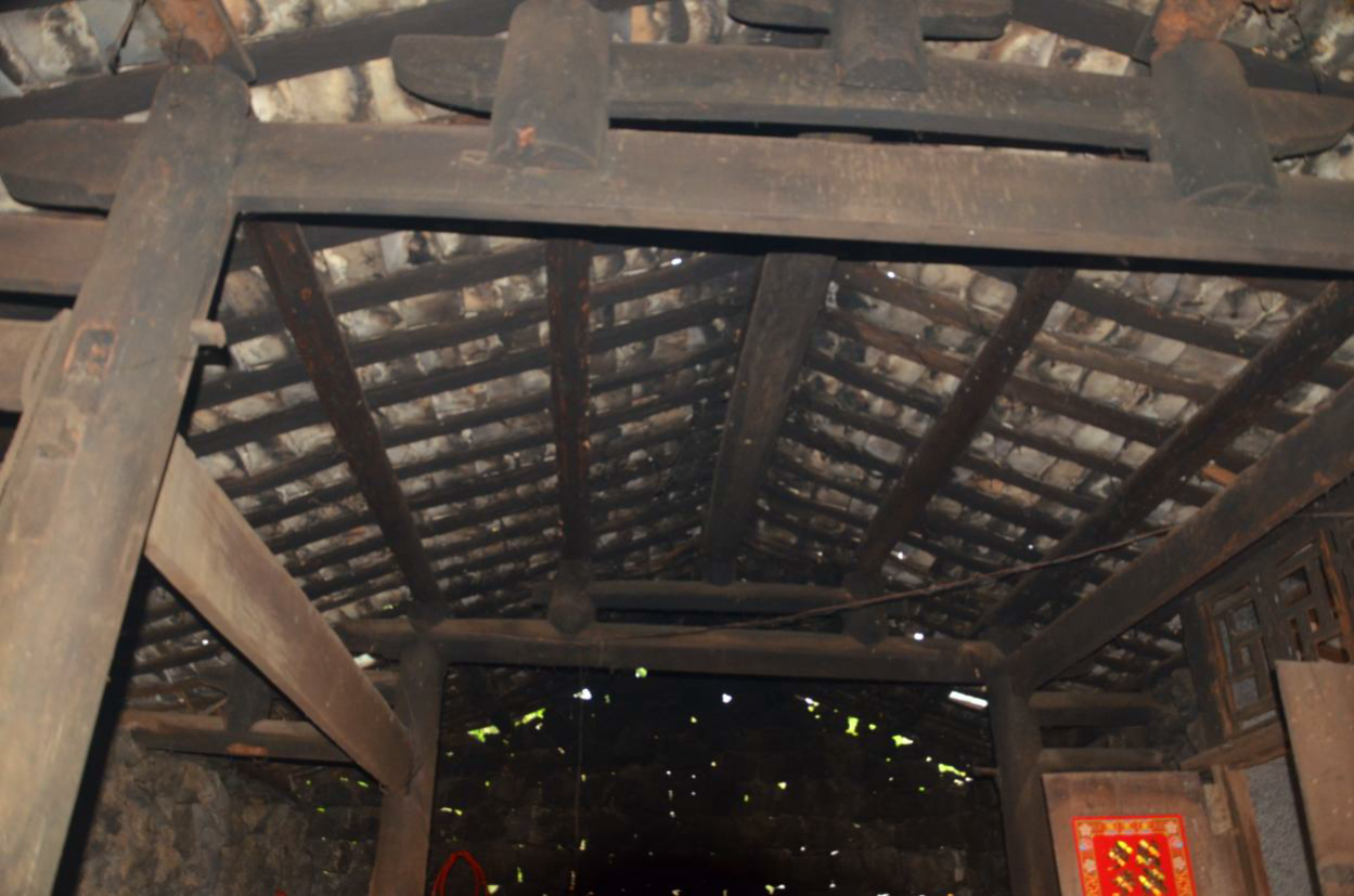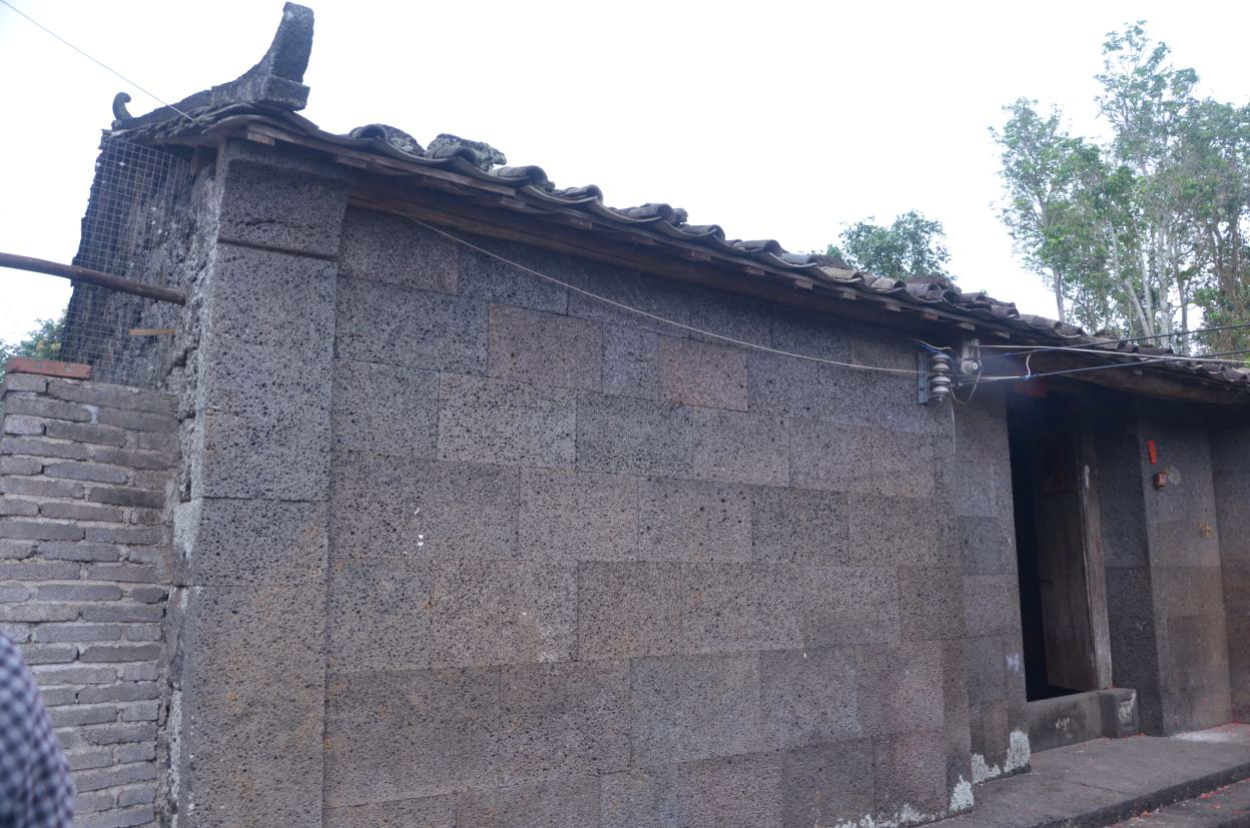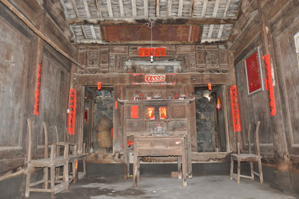 该院落整体格局保存较好,由两院、三正屋和多间杂屋组成,设有两处院门,建筑质量 基本完好,具有典型的琼北羊山地区传统民居风格特色,始建于明清时期。 院落内的三进正屋平面布局均为三开间;屋顶为硬山灰瓦坡屋顶,近年均已重修;外墙 采用干砌工艺由火山石砌筑;大门为双扇对开板门,均未开设窗户;室内地面铺装原为夯土, 现已被水泥地面取代。其中,东南侧正屋原内部结构木架已损坏,重修为砖石隔断,抹白灰, 建筑内部的原始风貌已被破坏。西南侧正屋和北侧正屋的整体风貌保存较完整,正立面大门 旁的墙上描有彩绘并设香炉,建筑内部梁架结构为穿斗式,采用铆榫工艺搭建,无漆;室内 隔断均为木质隔断;太师壁上方为神龛,雕刻有喻意“四季平安”、“花开富贵”的精致镂空雕 花,前方摆设供奉桌。 院落内的其它杂屋也均为传统民居特色较突出的硬山坡顶火山石建筑,其中,南侧两间 杂屋均为三开间、抬梁式建筑,大门有雕花,开设方形窗户。 院落西北侧的新建二层混凝土结构建筑仅为该院落的组成部分之一,不列为传统风貌建 筑。
