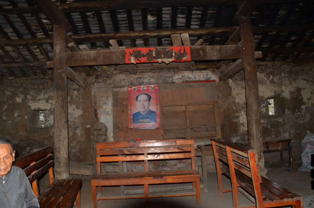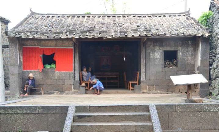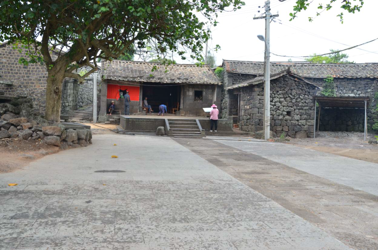 该组建筑原由神殿、拜亭和戏台组成,始建于清代,原为村民祭祀场所,现状为村民公 共活动场所。其中: 拜亭原由八根石柱构成,祭祀时拜亭的主要用途是祭献祭品,有时兼作演艺之地。但该 拜亭已于日本入侵海南时烧毁,现只留拜亭的基础。 神殿整体结构及风貌保存较为完好,具有典型的琼北羊山地区传统建筑样式。神殿平面 布局为一进三开间;屋顶为硬山灰瓦坡屋顶;外墙采用干砌工艺由火山石砌筑而成;正门原 为多隔扇门,现已损坏;大门两侧开设窗户,未设栏;建筑内部梁架结构为抬梁式,采用铆 榫工艺搭建,梁头及瓜柱均雕有火山图腾样式,无漆,梁柱木架为清代留存至今,现仍留有 日军火烧村庄时烟火熏黑的明显痕迹;殿内正壁原描有彩画,并书对联“三才道义宗仪府, 卿相经纶祖素王”(注:三才:天时、地利、人和。道义:道德和正义;宗仪:指有关宗庙 的典章礼仪。卿相:有学识之人。经纶:管理。祖:效仿,学习。素王:孔子的别称),但 彩画与对联均已于二十世纪七十年代文革运中损坏;室内地面铺装原为夯土,现已被水泥地 面取代。