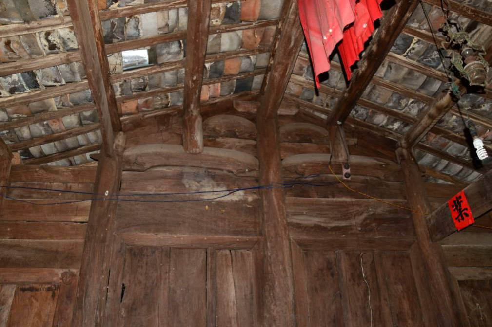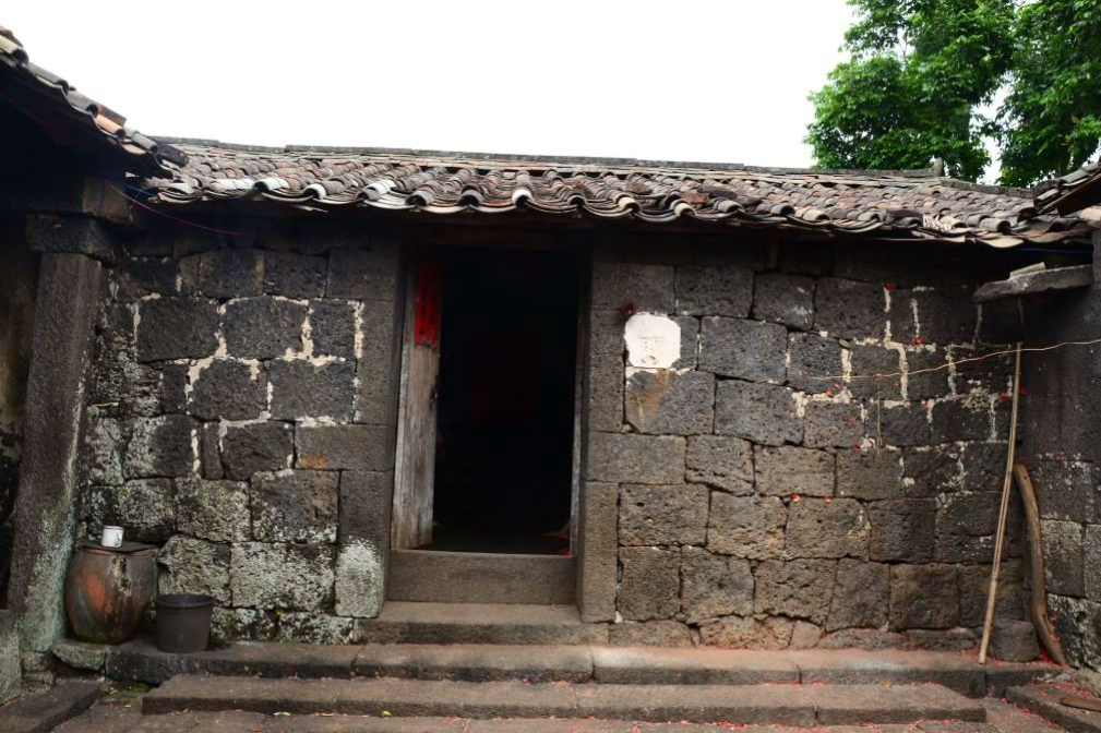 该院落户主为裁缝世家。 院落内建筑格局保存较完整,由前、后院及一正屋一女儿房(门房)多间小杂屋组成;建筑 质量基本完好,整体风貌较好,具有典型的琼北羊山地区传统民居特点,始建于清代;现状 仍为居住功能。 正屋建筑为一进三开间的平面布局;正屋建筑朝向为东北—西南向,与琼北地区主导风 向基本一致;屋顶为硬山灰瓦坡屋顶;外墙采用干砌工艺由火山石砌筑而成;正门均为双扇 对开板门,未开设窗户;建筑内部梁架结构为穿斗式,梁头雕刻有火山图腾样式的雕花,木 架均为清代留存至今,无漆;室内隔断均为木质隔断;太师壁上方为神龛,前方摆设供奉桌; 室内地面铺装原为夯土,现已被水泥地面取代。 女儿房是一间约 12 平方米、位于院门旁的小房屋,平时一般作为臵物间,但当户主女儿 出嫁前夕,该房屋即为女儿休息及婚嫁当日的出阁之所。
